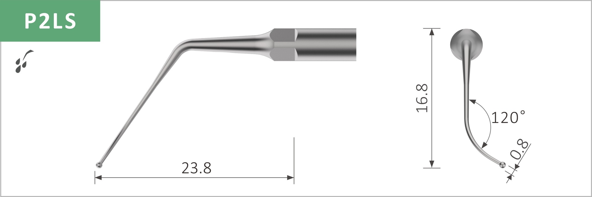 Perio. Links gebogenes Instrument mit einer kleinen Kugel >0,8 mm Durchmesser an der Instrumentenspitze zur parodontalen Debridement von Furkationen und Konkavitäten.