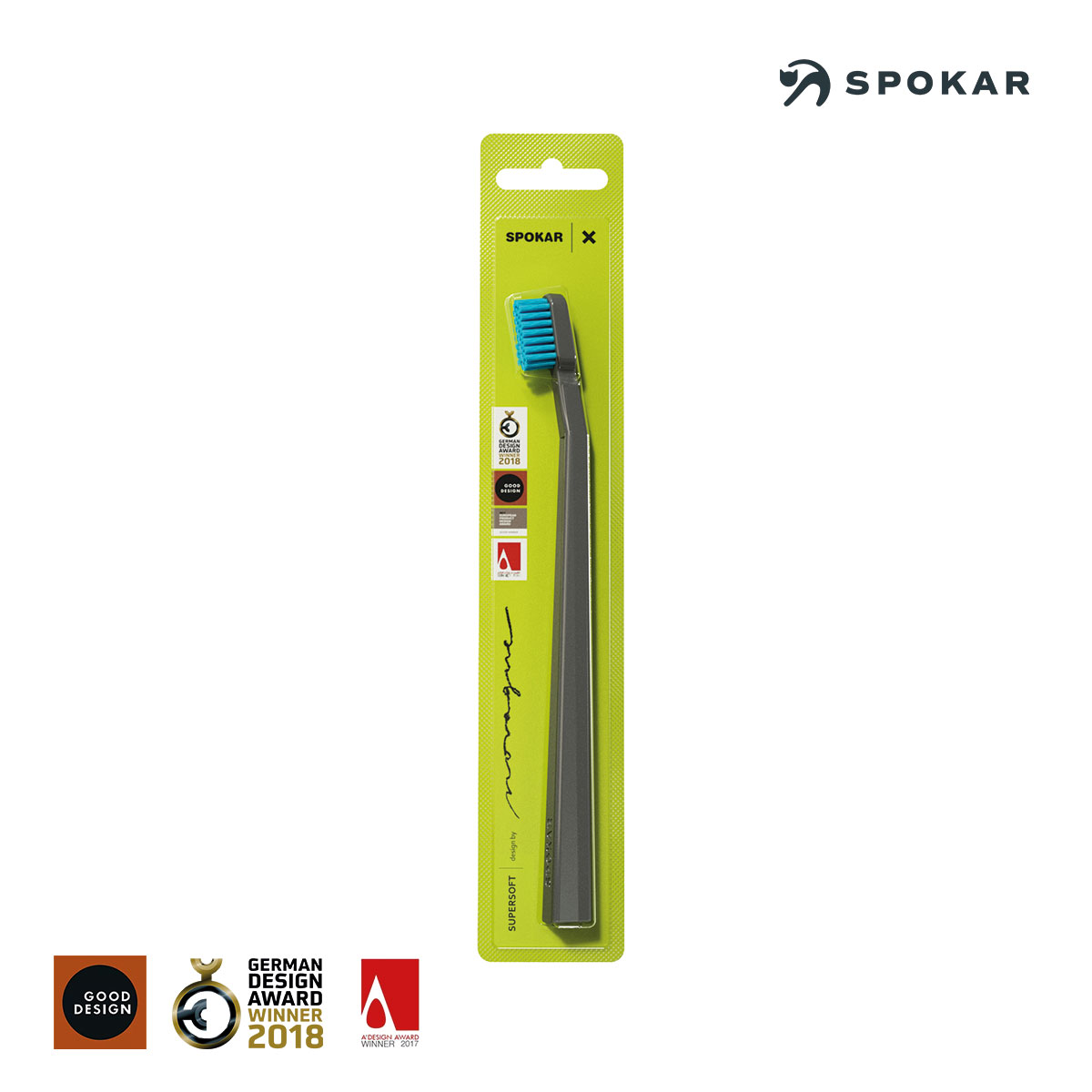 Das Design der SPOKAR X SUPERSOFT- Zahnbürste stammt vom führenden tschechischen Designer MgA. Petr Novague , der für seinen innovativen Ansatz zahlreiche internationale Auszeichnungen erhalten hat.