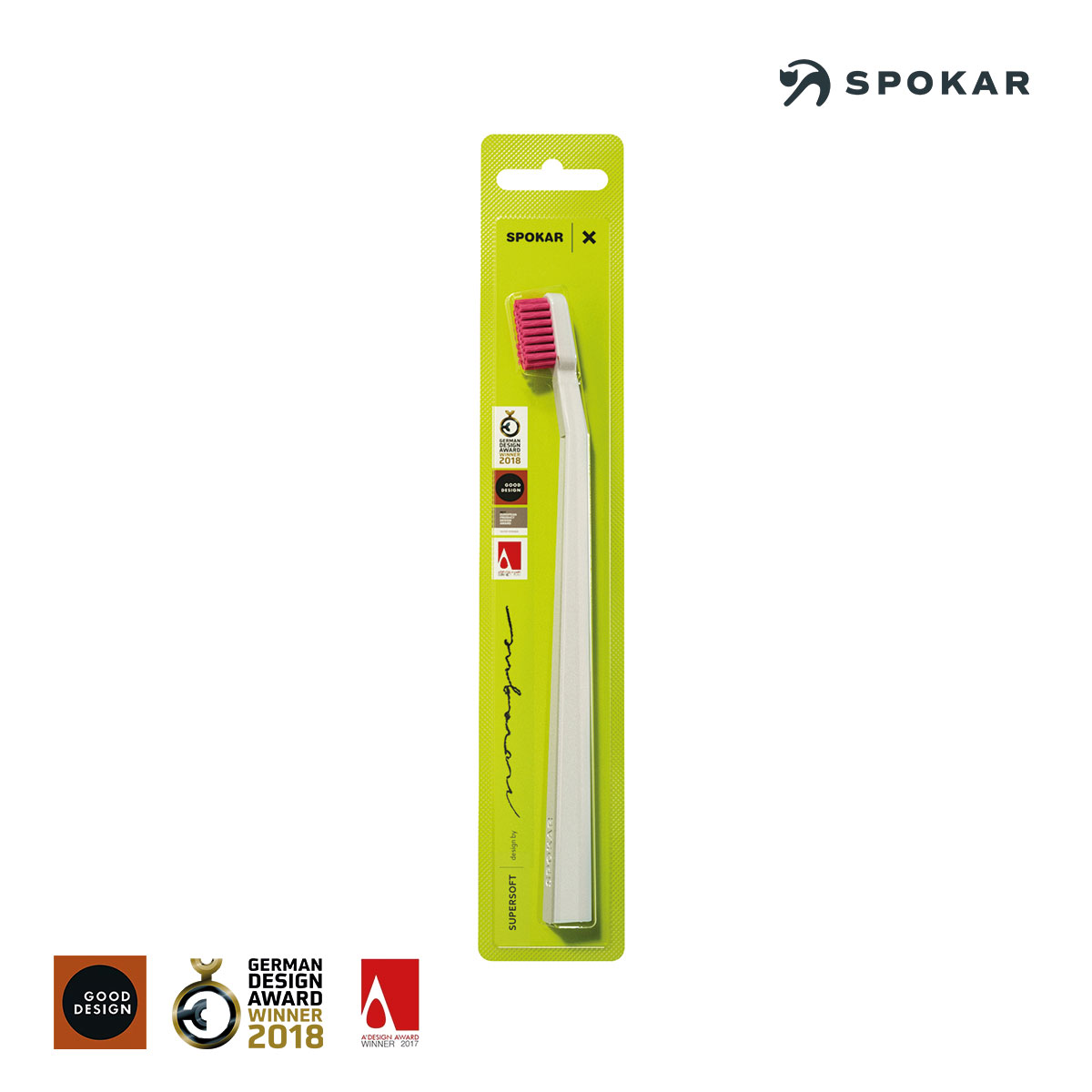 Das Design der SPOKAR X SUPERSOFT- Zahnbürste stammt vom führenden tschechischen Designer MgA. Petr Novague , der für seinen innovativen Ansatz zahlreiche internationale Auszeichnungen erhalten hat.